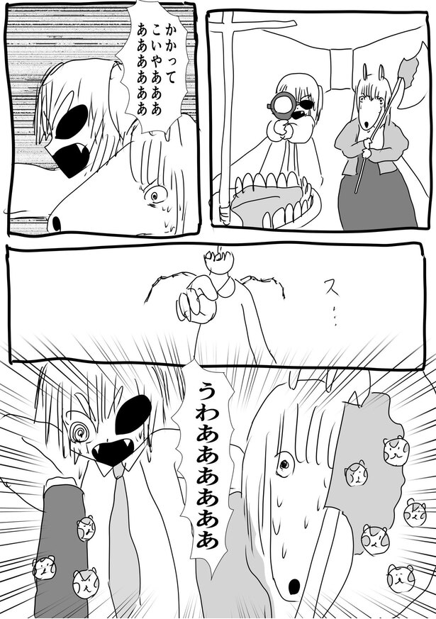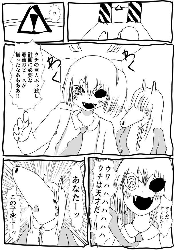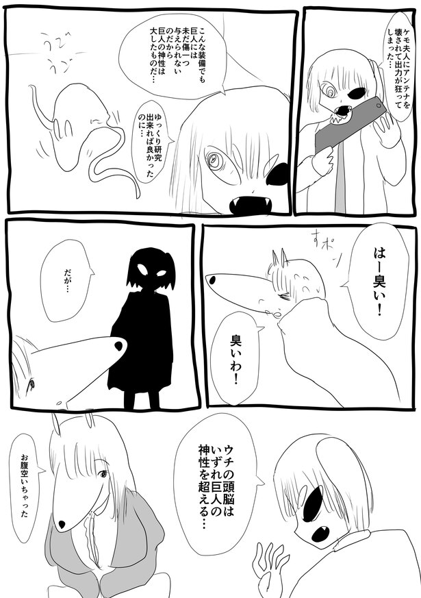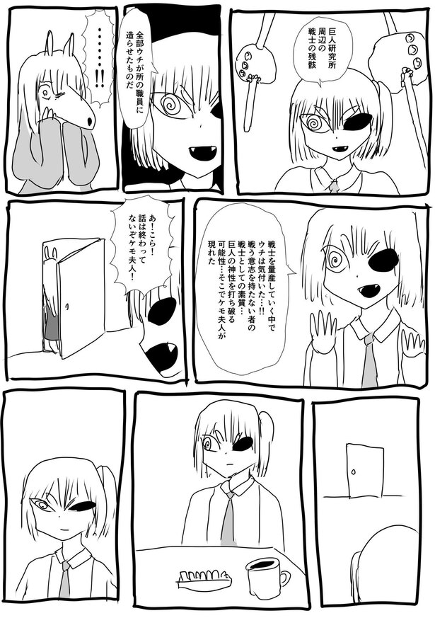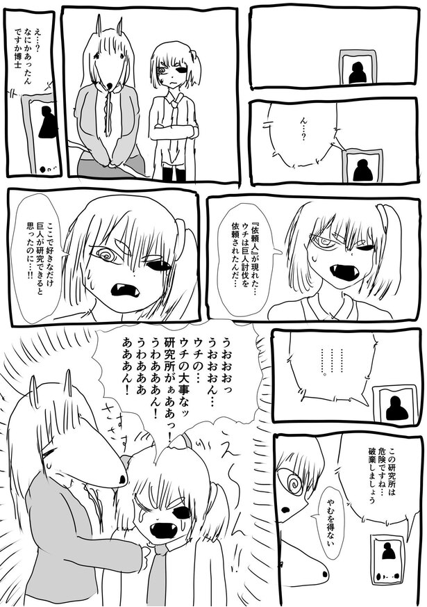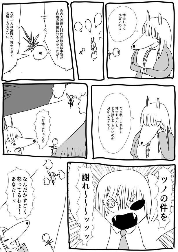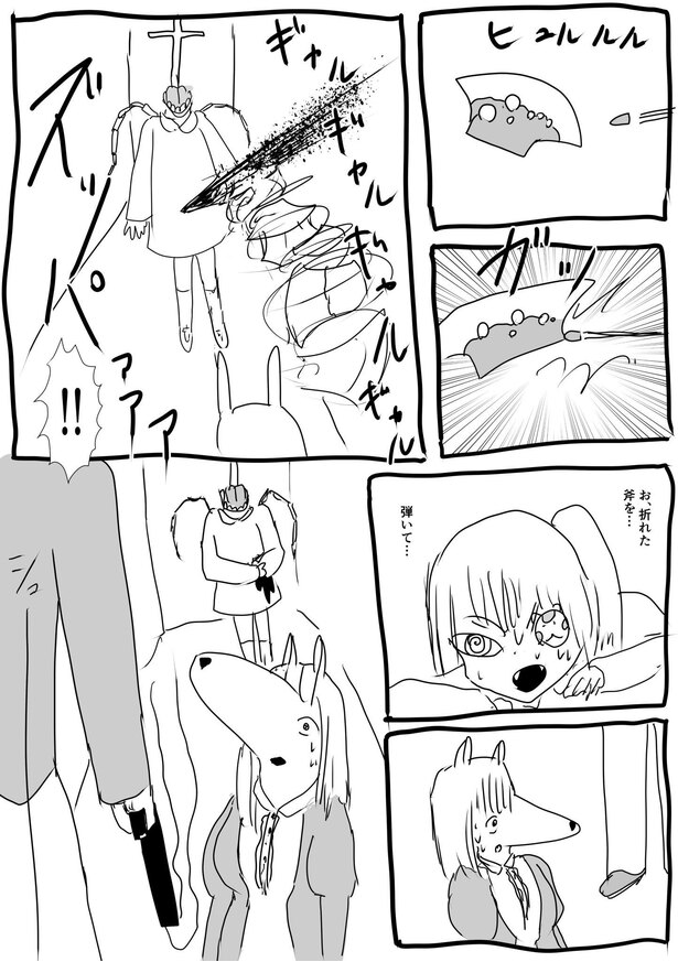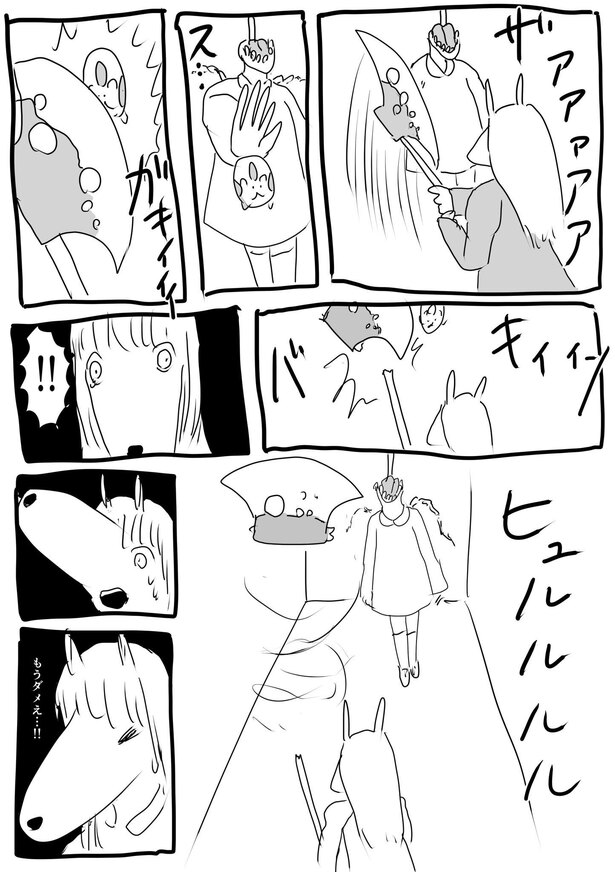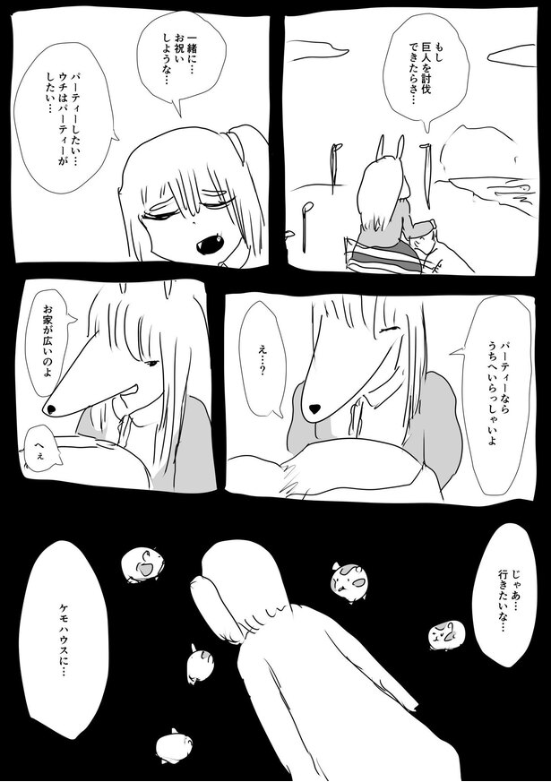 「可愛い奥さんが困っている姿が見たかったので、いきなり斧を渡されて巨人を討伐してください、と言われたら物凄く困るんじゃないかと思いました。そして斧を渡されたケモ夫人は、この人絶対にちょうちょしか捕まえたことないだろうな、絶対巨人討伐できないだろうなと思いました。とにかく困ってほしかったんです。困っているのを見たかったんです」